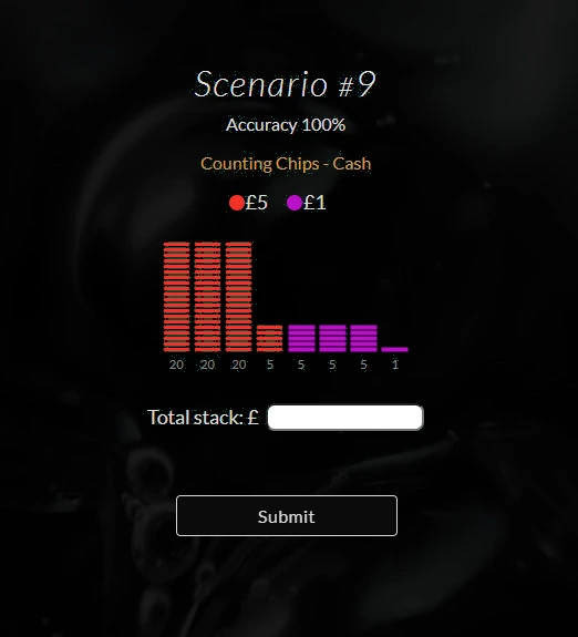 You will be shown a chip stack that would emulate a player's chip stack in a cash game and you must correctly count it.